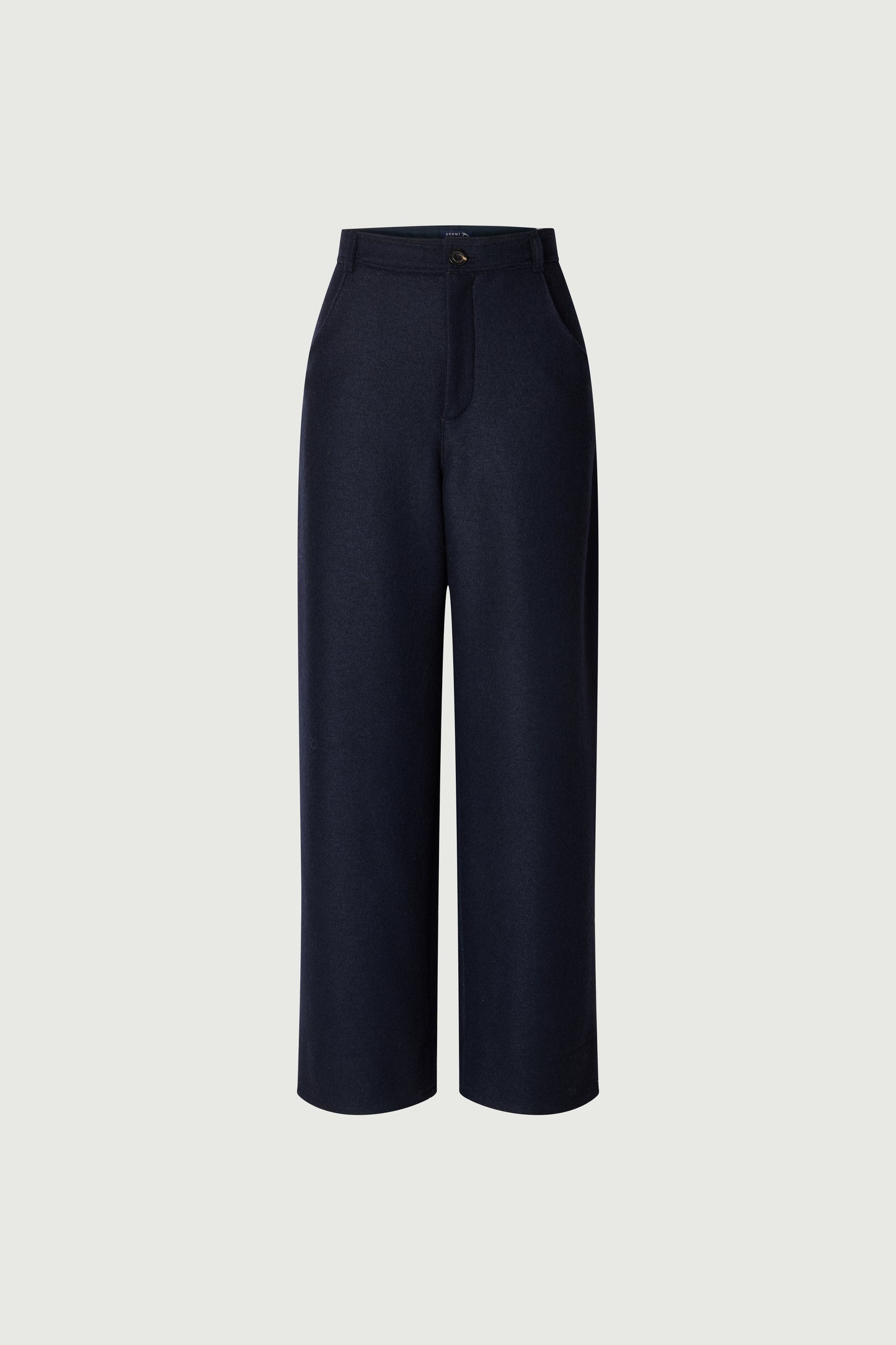BAYONNE is a boiled wool trouser with a minimalist vibe, featuring raw and unfinished edges without seams. It stands out with its rounded leg, drape, and a dartless waistband that suits all body shapes.