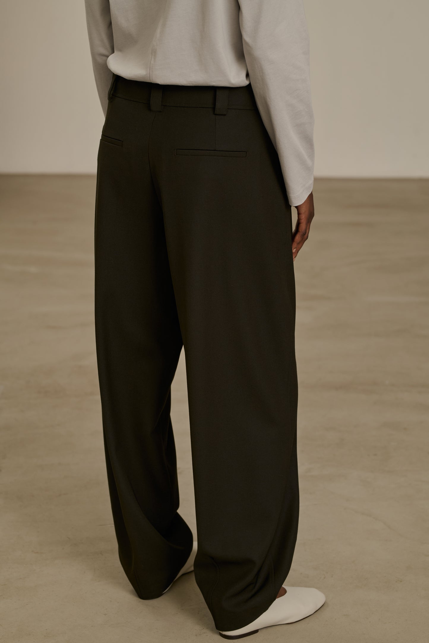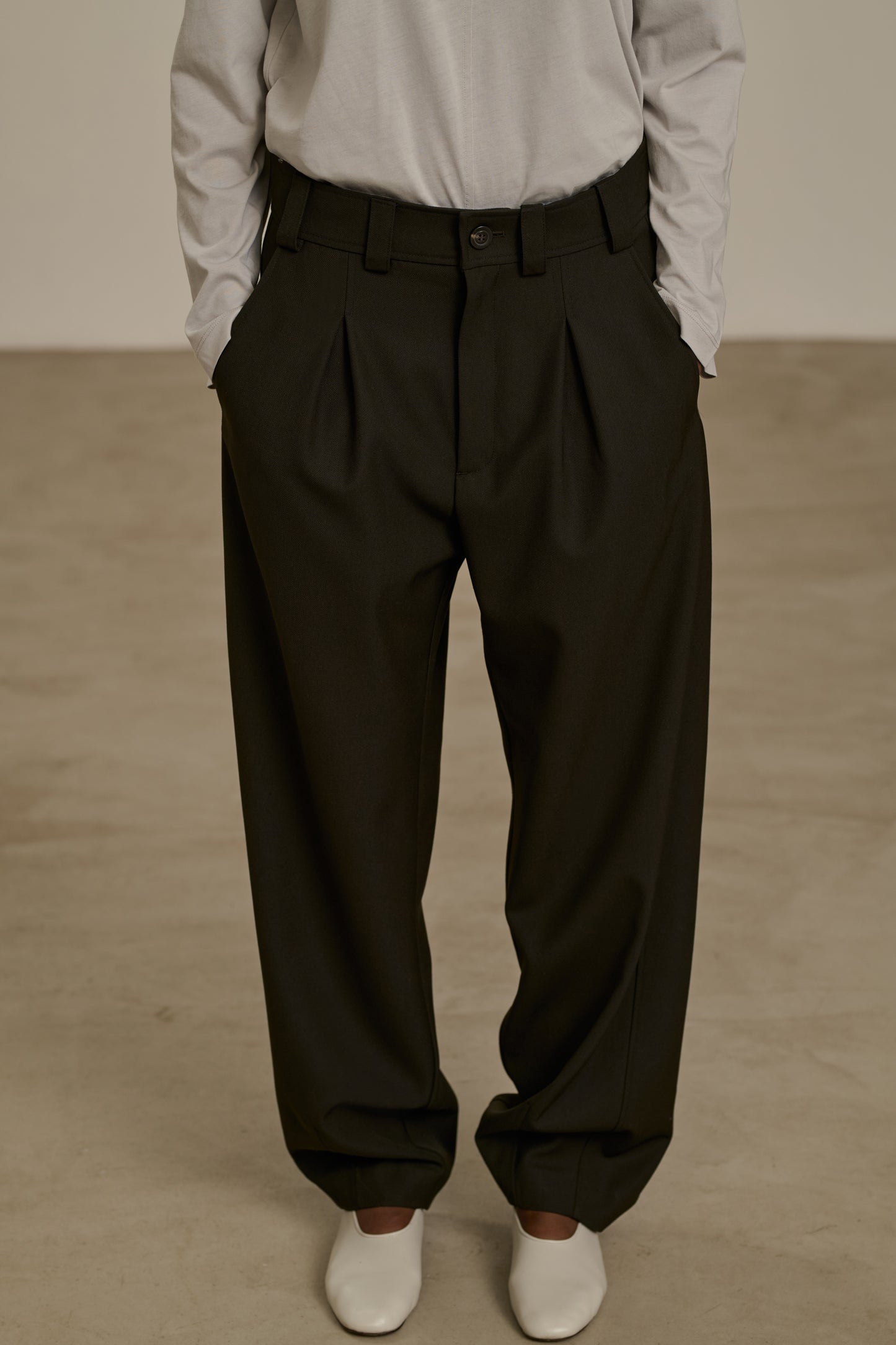TIMON is a pleated trousers to be worn high-waisted with a belt and gathered, or low-waisted resting on the hips. It creates a controlled voluminous effect, paired with an oversized wardrobe. Match it with the TIMON trousers for a complete autumn look in wool gabardine.